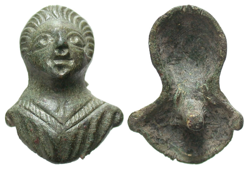 Roman Bronze Applique, Female Bust. 1st-3rd century A.D. 7.62 g, 30x21 mm.
