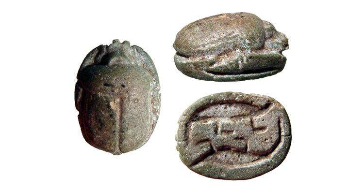 An Egyptian faience scarab with a pair of crocodiles, 3rd Intermediate Period, c. 1075 - 664 BC, the body nicely molded with detailed head and legs. On base, a pair of crocodiles head to tail. Intact, glaze now a greyish-green, holed lengthwise for suspension. 2.0 x 2.3 cm. Ex Los Angeles private collection.