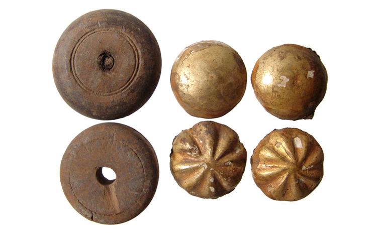 A lot of 4 gilded wood rosettes and a pair of wood Spindle Whorls, Graeco-Roman, c. 1st Century BC - 2nd Century AD, the four gilded pieces with a resin & linen backing where they formed part of the elaborate covering for the mummy. Sizes from 2 cm to 4 cm in diameter. Ex Orange County private collection