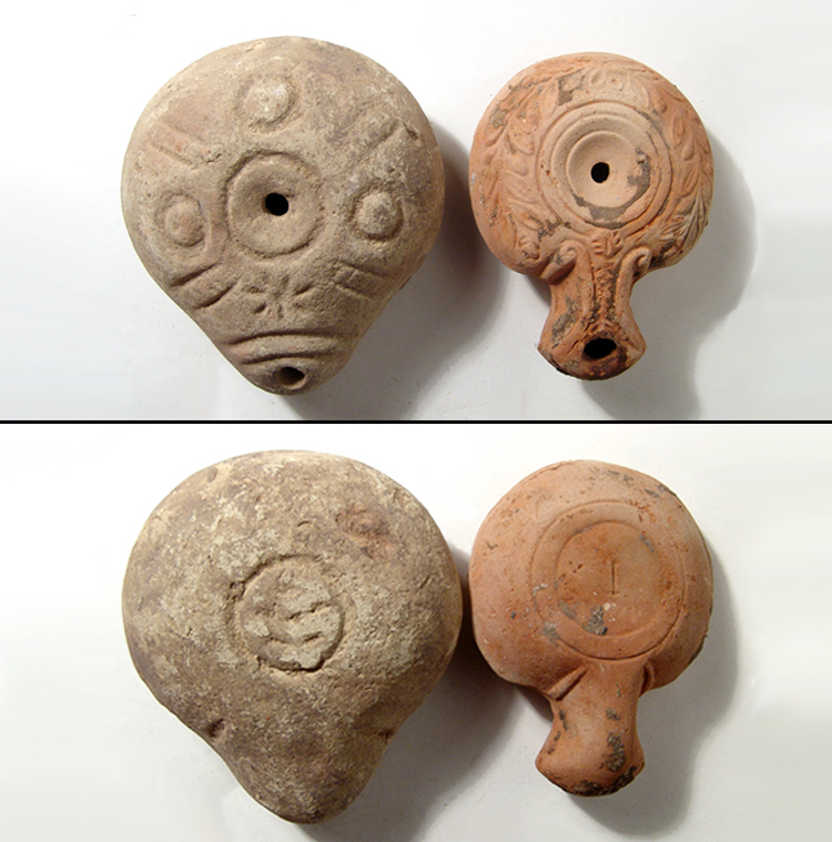 A pair of Roman ‘frog’ lamps from Egypt, 3rd - 4th Century AD, the first is in a crème ware and rather large, the body of lentoid shape, the nozzle rounded, the wide shoulders decorated with raised circles and hatched bands, star on the nozzle above a double curved line. On base, an incised circle enclosing 6 indented lines. L: 4 ½” (11.6 cm). The second of light orange ware, the lentoid body with long spout with spade-shaped nozzle. The shoulders are decorated with a laurel-wreath, the base with an ‘I’ within a low ring base. L: 4 ¼” (11 cm). Both are intact with light deposits. Ex Orange County private collection.