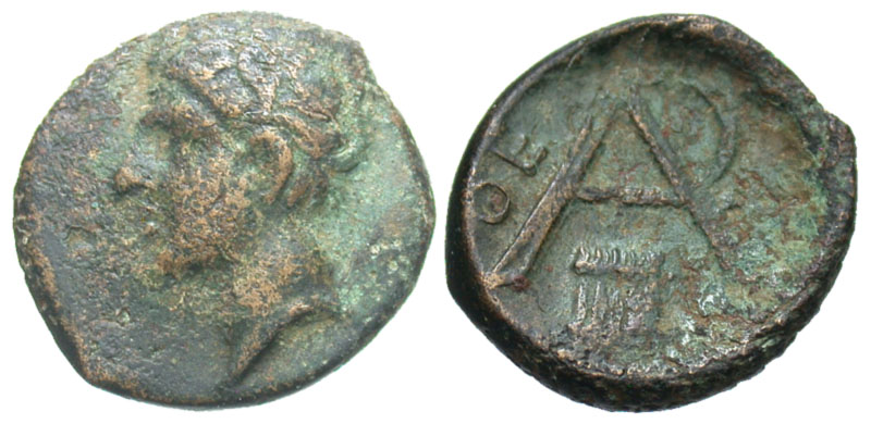 ARKADIAN LEAGUE, Megalopolis. 300-275 BC. AE Trichalkon (3.44 gm). Head of Pan / Monogram over syrinx. BCD.1537. BMC.70-71. VF, olive patina. Ex. BCD collection.