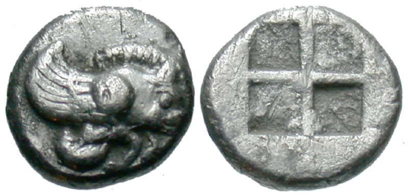 IONIA, Klazomenai. V Century BC. AR Diobol (1.07 gm). Forepart of winged boar / Quadripartite incuse square SNG.Turkey.335. VF. Scarce.