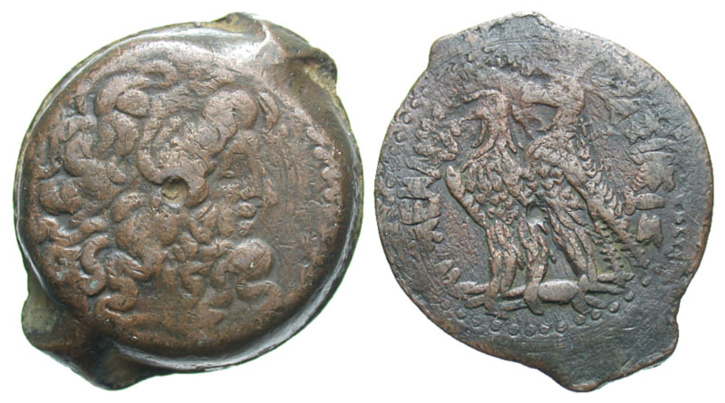 PTOLEMAIC KINGDOM. Ptolemy V Epiphanes, 205-180 BC. AE 39 Drachm (38.14 gm). Head of Zeus-Ammon / Two eagles on thunderbolt, wings closed, heads left. Svor.1423. SNGCop.304. aVF, red-brown patina. Scarce. Ex Mark Bir collection.