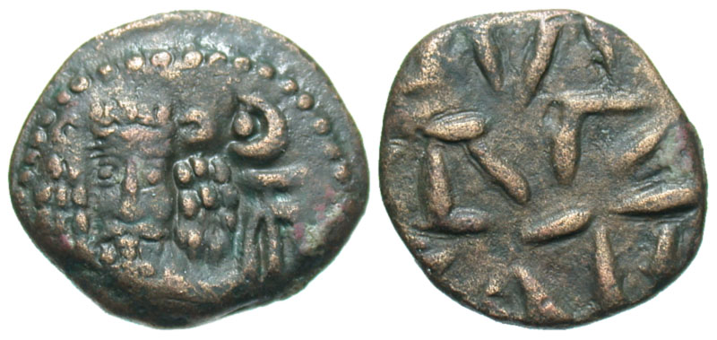 ELYMAIS. Kamnaskires Orodes, early-mid II Century AD. AE Drachm (3.50 gm). Facing diademed bust with bushy hair and top tuft, anchor and crescent / Irregular series of dashes. vHaaff.12.3.1. VF+, brown patina.