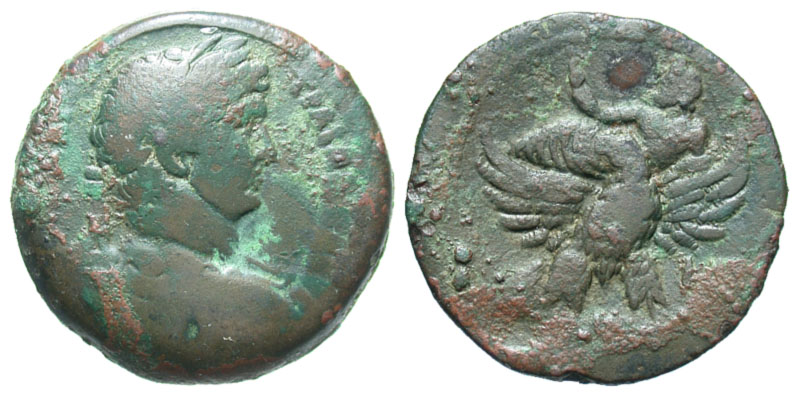 ROMAN EGYPT. Hadrian (117-138 AD. AE Drachm (23.45 gm), year 14. Laureate draped bust / Zeus reclining. holding sceptre and reed, riding eagle. Koln.1024. aVF, brown patina.