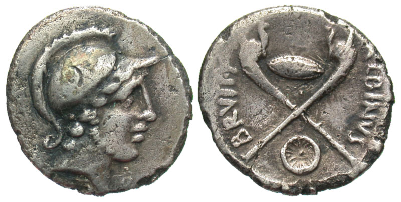 ROMAN REPUBLIC. Albinus Bruti F., 48 BC. AR Denarius (3.48 gm). Helmeted head of Mars right / Gaulish implements. RSC. Postumia.11. Toned VF. Scarce.