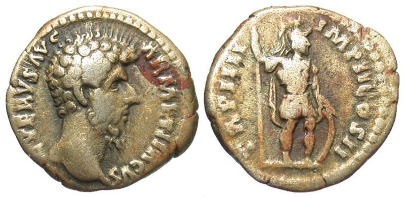 LUCIUS VERUS, 161-169 AD. AR Denarius (3.16 gm), 163-4. Bare head / Mars standing with spear and shield. RIC.515. Toned aVF.