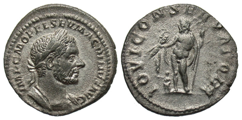 MACRINUS, 217-218 AD. AR Denarius (3.16 gm). Laureate and cuirassed bust / Jupiter standing holding thunderbolt and sceptre, emperor at feet. RSC.37. RIC.76. Toned aXF.
