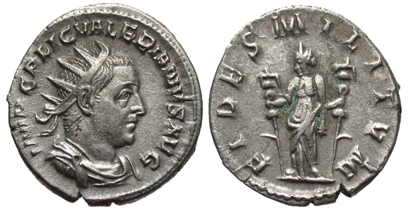 VALERIAN I, 253-260 AD. AR Antoninianus (3.24 gm). Radiate bust / Fides holding two ensigns. RIC.6(S). Toned aXF.