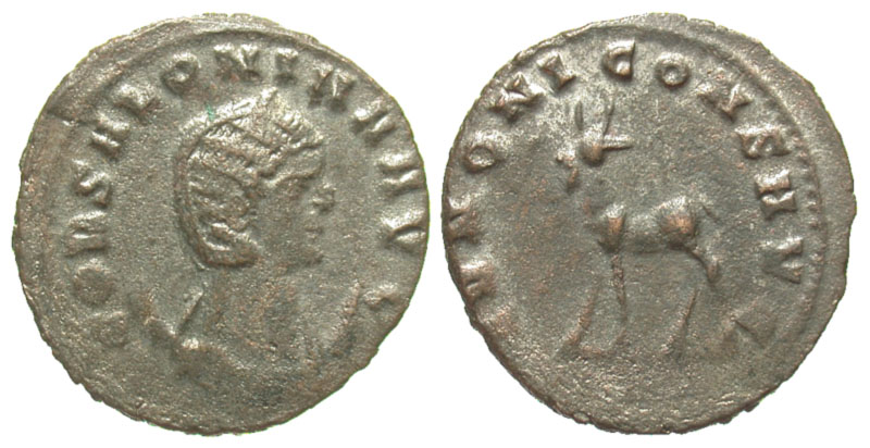 SALONINA, wife of Gallienus, 254-268 AD. Silvered AE Antoninianus (2.99 gm). Draped bust on crescent / Doe walking, head reverted. RIC.15. Toned VF. Scarce.