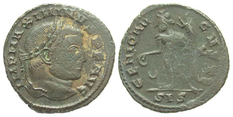 MAXIMINUS II, DAIA, 309-313 AD. AE Follis (5.48 gm) of Siscia 309-311 AD. Laureate head / Genius standing holding patera and cornucopiae. RIC.198a. VF, dark brown patina