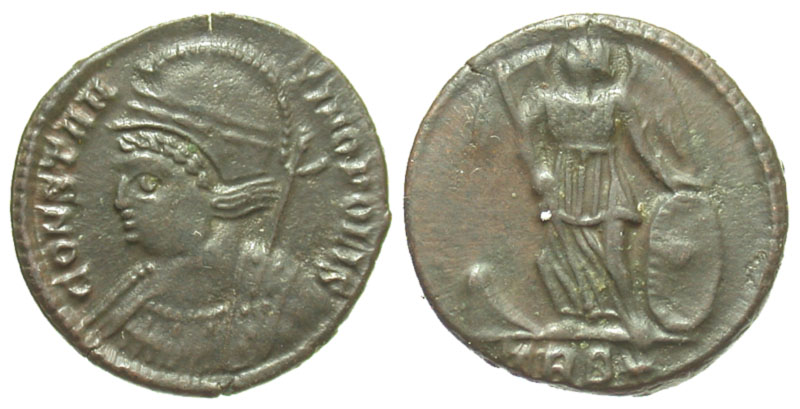 CONSTANTINOPOLIS, 330-340 AD. AE Follis (2.69 gm) of Trier. Armoured bust of Constantinopolis / Victory standing on prow. RIC.548. Near Mint, brown patina, worn dies.