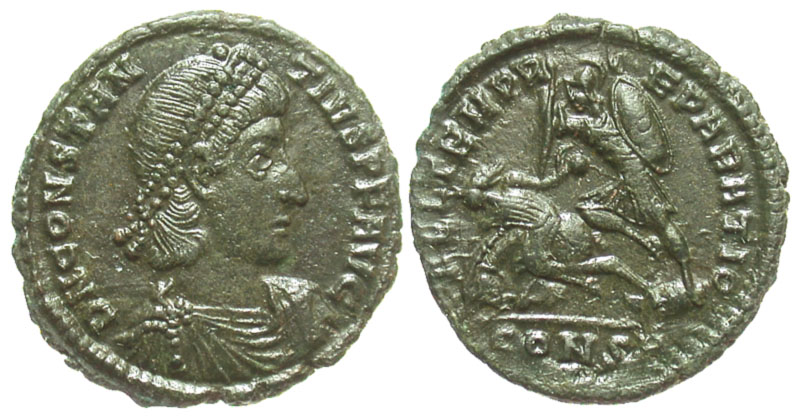 CONSTANTIUS II, 337-361 AD. AE Half Centenionalis (2.27 gm) of Constantinople. Diademed draped bust / Infantryman spearing fallen horseman. RIC.118. XF, dark brown patina.