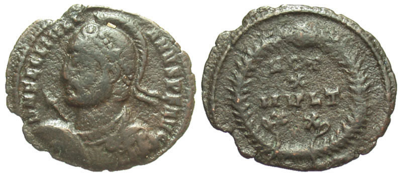JULIAN II the APOSTATE, 360-363 AD. AE Follis (2.02 gm). Helmeted bust with spear and shield / Wreath with votive inscription. aVF, brown patina.