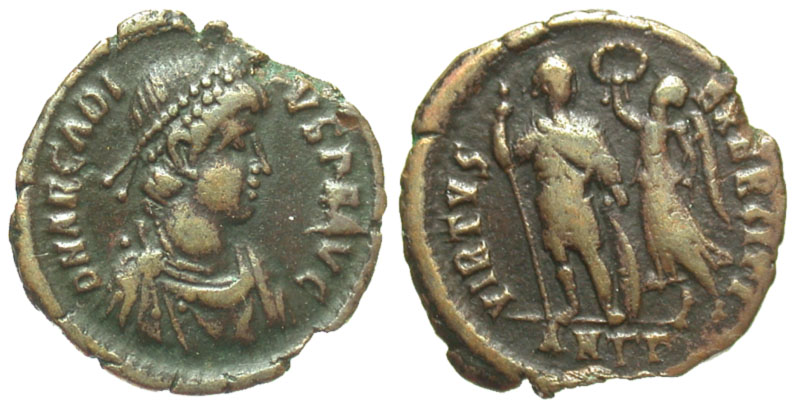 ARCADIUS, 383-408 AD. AE Reduced Follis (1.85 gm) of Antioch. Diademed draped bust / Emperor standing, crowned by Victory. RIC.70. VF, brown patina