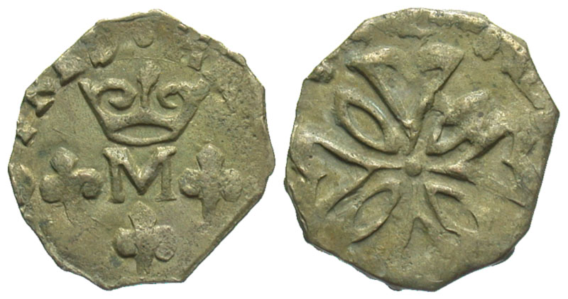 FRANCE, Orange. Maurice de Nassau, 1618-1625 AD. Billon Liard (0.85 gm). Crowned M with three lis / Floral Maltese cross. Rob.5884. B.1002. VF+