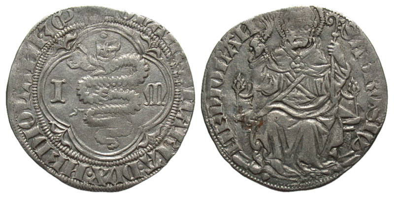 ITALY, Milan. Giovanni Maria Visconti, 1402-1412 AD. AR Grosso (2.36 gm). Biscia in quatrefoil / Saint Ambrose enthroned facing, holding crosier and whip. MIR.134. Biaggi.1484. Toned VF.