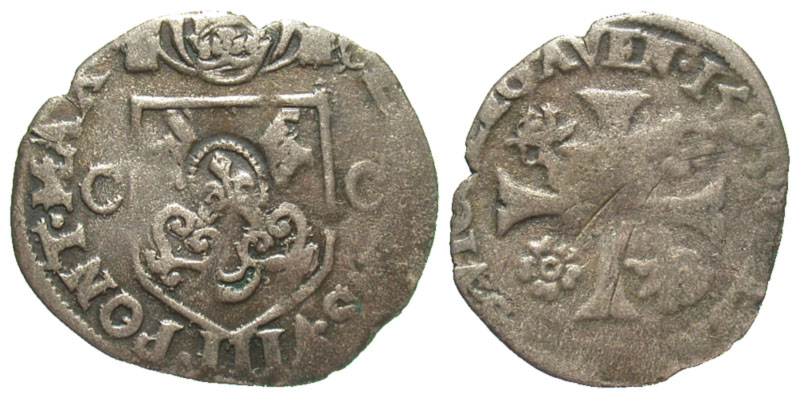 ITALY, Papal States. Clement VIII, 1592-1605 AD. Billon Douzain (2.13 gm), Carpentras , 1593. Shield of arms under tiara and keys / Cross with roses and lions. Ber.1528. Toned aVF. C/m lis.