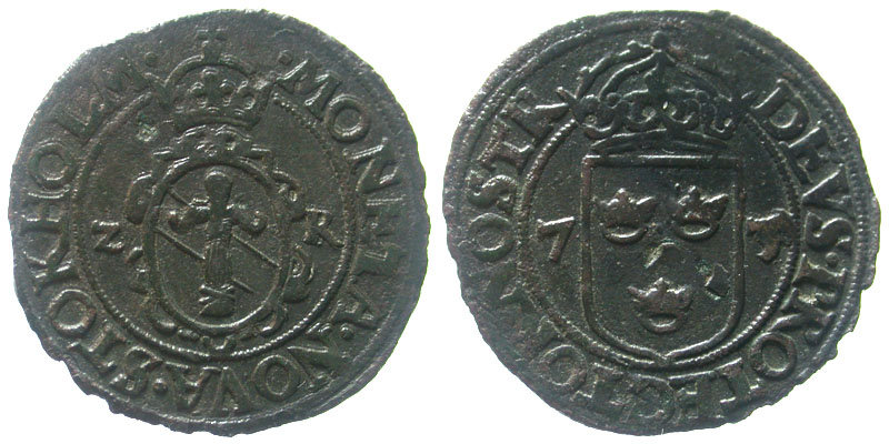 SWEDEN. Johann III, 1568-1592 AD. Billon 2 Ore (2.26 gm) of Stockholm, 1573, ZR. Crowned Vasa arms / Crowned arms of Sweden. Tingstr�m.26. Toned VF.