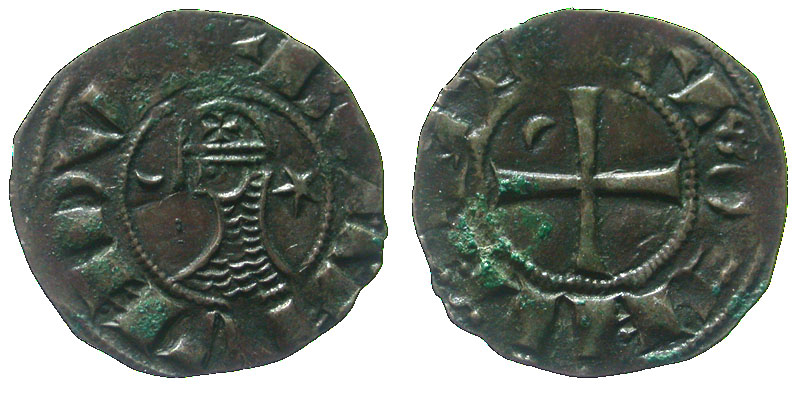 ANTIOCH. Bohemund III, 1163-1201 AD. AR Denier (1.03 gm), class B. Bust wearing chain-mail and helmet ornamented with cross, star and crescent in field / Cross with one crescent. MPS.66b. Toned VF+.