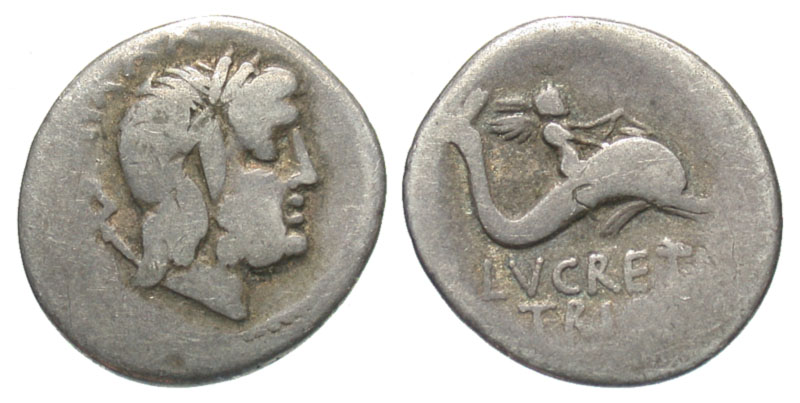 L. Lucretius Trio. 74 B.C. AR denarius (19.4 mm, 3.58 g, 1 h). laureate head of Neptune right, trident behind / L·LVCRETI TRIO, winged Genius riding dolphin right. Crawford 390/2 ; Sydenham 784; RSC Lucretia 3. aFine.