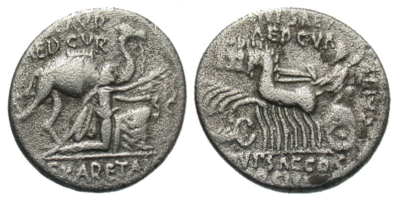 M. Aemilius Scaurus & Pub. Plautius Hypsaeus. 58 B.C. AR denarius (17.6 mm, 2.81 g, 1 h). Rome mint. M SCAVRV above, AED CVR in below, EX - SC on either side, REX ARETAS in exergue, King Aretas kneeling beside camel right, offering olive branch / P HVPSAEVS/AED CVR above, C·HVPSAE COS/PREIVER in exergue, CAPTV on right, Jupiter driving quadriga left. Crawford 422/1b; Sydenham 913; RSC Aemilia 8. Fine.