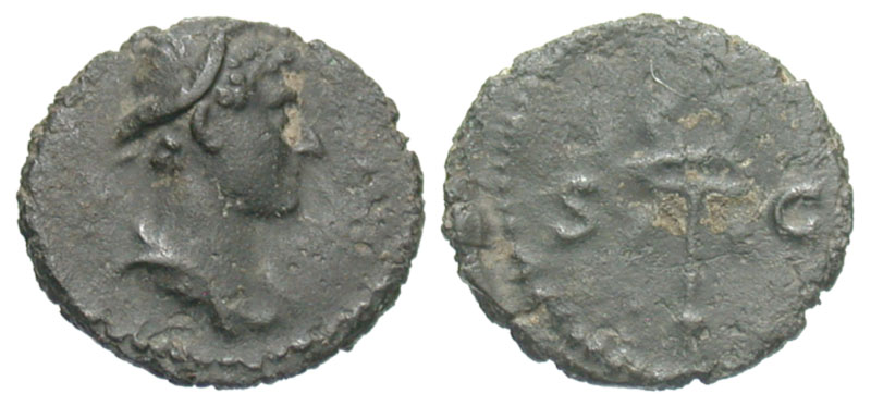 Anonymous. Domitian to Antoninus Pius. Æ quadrans (14.0 mm, 1.60 g, 5 h). Rome mint, Struck A.D. 81-161. Bust of Mercury right, wearing petasus / S-C, winged caduceus. RIC 31. Fine, porous.