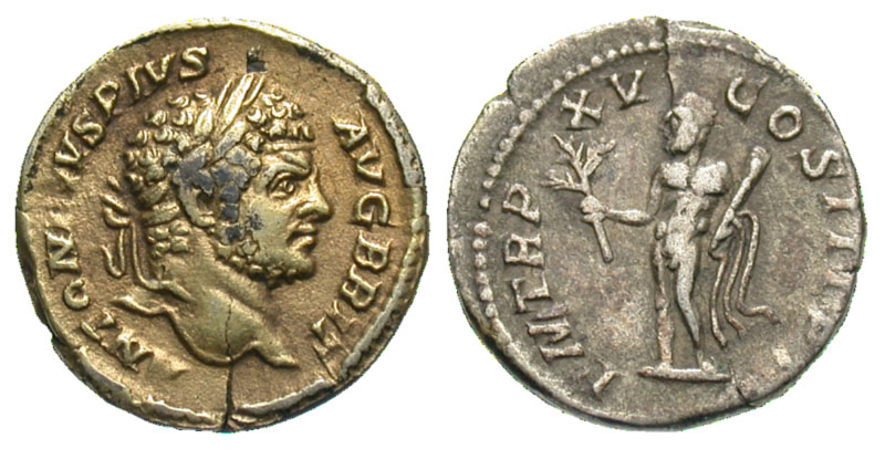 Lot 25-090. Caracalla. A.D. 198-217. AR gold-plated denarius. Rome mint, Struck A.D. 213.