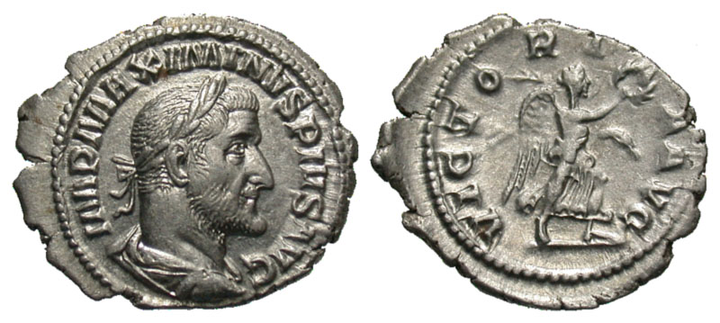 Maximinus I 'Thrax'. A.D. 235-238. AR denarius (21.7 mm, 2.65 g, 5 h). Rome mint, Struck A.D. 235. IMP MAXIMINVS PIVS AVG, laureate, draped and cuirassed bust right / VICTORIA AVG, Victory advancing right, holding wreath and palm. RIC 16; BMCRE 25; RSC 99. VF.