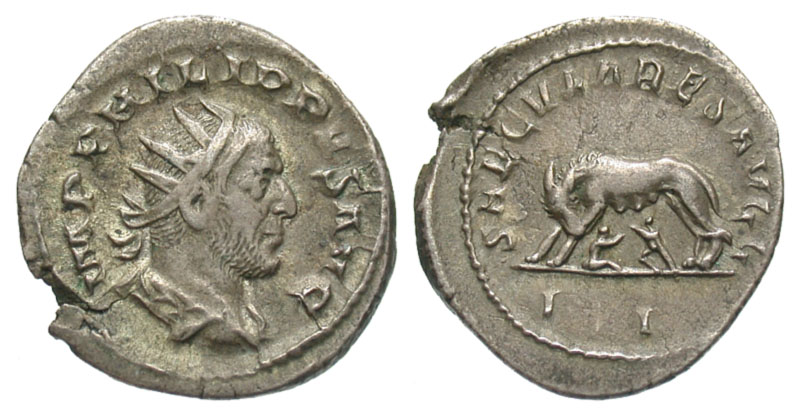Philip I. A.D. 244-249. AR antoninianus (23.9 mm, 4.49 g, 6 h). Rome mint, Struck A.D. 248. IMP PHILIPPVS AVG, radiate, draped and cuirassed bust right / SAECVLARES AVGG, She-wolf standing left, suckling the twins, Romulus and Remus; II in exergue. RIC 15; RSC 178. VF.