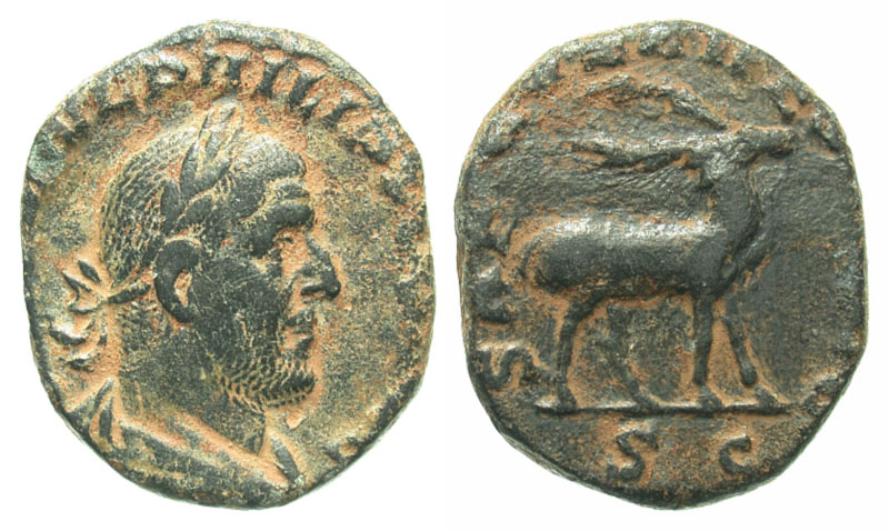 Philip I. A.D. 244-249. Æ sestertius (26.6 mm, 14.02 g, 6 h). Rome mint, Struck A.D. 248. IMP M IVL PHILIPPVS AVG, laureate, draped and cuirassed bust right / SAECVLARES AVGG, S-C, stag standing right. RIC 160a. VF, red highlights.