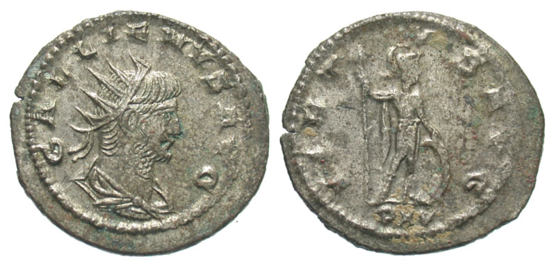 Gallienus. A.D. 253-268. BI antoninianus (21.5 mm, 3.07 g, 6 h). Antioch mint, Struck A.D. 266-267. Scarce type. GALLIENVS AVG, radiate, draped, and cuirassed bust right / VIRTVS AVG, Soldier standing right, holding spear and leaning on shield, PXV in exergue. Göbl 1666i; RIC 612A (Asian mint). aVF, fully silvered.