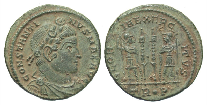 Constantine I. A.D. 307/10-337. Æ 3 (17.5 mm, 2.15 g, 11 h). Trier mint, Struck A.D. 330-335. CONSTANTINVS MAX AVG, rosette-diademed, draped and cuirassed bust right / GLORIA EXERCITVS, two helmeted soldiers standing facing each other, holding spear and shield, two standards between them; TR·P in exergue . RIC 537. gVF, sandy patina.