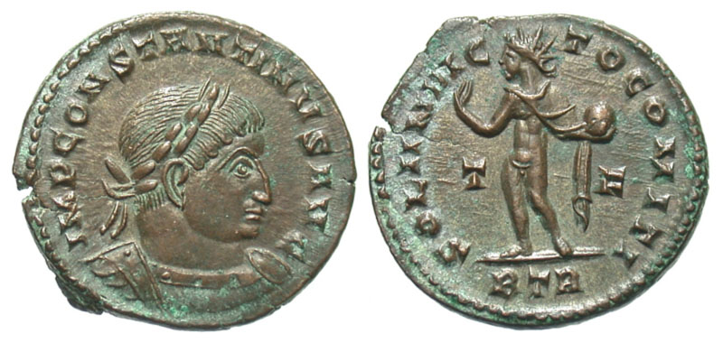 Constantine I. A.D. 307/10-337. Æ Follis (20.5 mm, 3.64 g, 5 h). Trier mint, Struck A.D. 317. IMP CONSTANTINVS AVG, laureate and cuirassed bust right / SOLI INVICTO COMITI, Sol standing left, holding globe; T-F in fields, BTR in exergue. RIC 102. gVF.