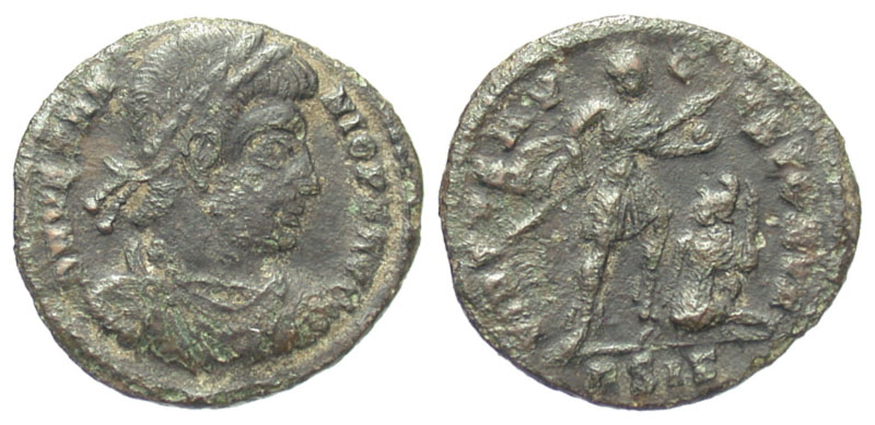 Vetranio. A.D. 350. Æ half centenionalis (19.0 mm, 2.18 g, 7 h). Siscia mint. Very Rare. D N VETRANIO P F AVG, laureate, draped and cuirassed bust right / VIRTVS AVGVSTORVM, Emperor, bare-headed and in military dress standing right, holding spear in right hand, and a globe in left, and kicking a seated captive, The captive wears a pointed cap and raises his left hand to his head; ЄSIS in exergue. RIC 296; LRBC 1182. aVF.