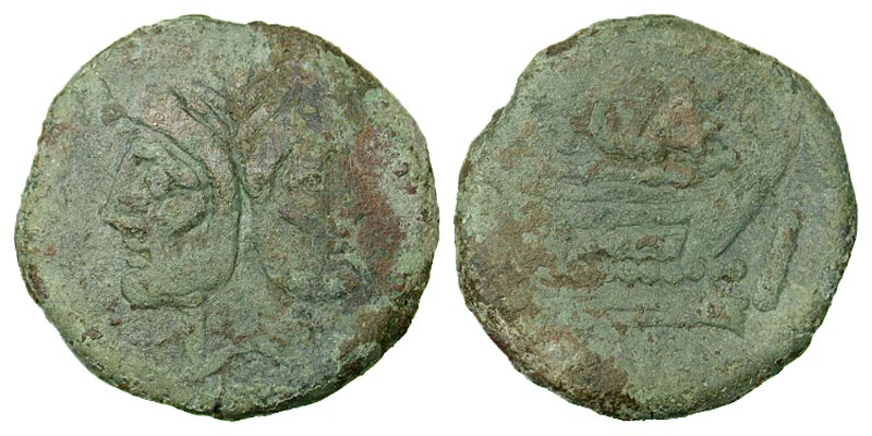 A. Caecilius A.f. Ca. 169-158 B.C. Æ as (32.7 mm, 25.05 g, 2 h). Uncial standard. Rome. Ex Goodman collection. Laureate head of bearded Janus; I above / C·CAE / ROMA, Prow of galley right; I to right. Crawford 174/1; Sydenham 355. Fine, green patina.