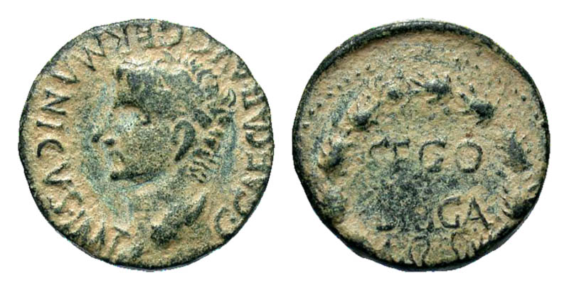 Hispania, Segobriga. Gaius (Caligula). A.D. 37-41. Æ 21 (21.0 mm, 5.00 g, 4 h). C CAESAR AVG GERMANICVS IMP, bare head left / SEBO/BRIGA, legend within oak wreath. ACIP 3247; RPC 477. VF.