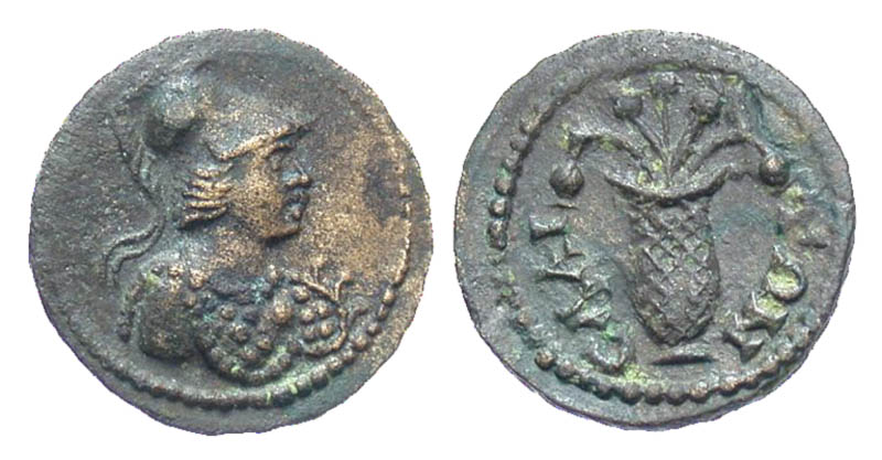 Aeolis, Elaea. Civic Issue. ca. second century A.D. Æ 13 (14.5 mm, 1.73 g, 1 h). Helmeted bust of Athena right, wearing aegis / EΛAITΩN, kalathos with two grain ears and three poppies. RPC tenp 1801; SNG Cop 187; BMC 36. VF.