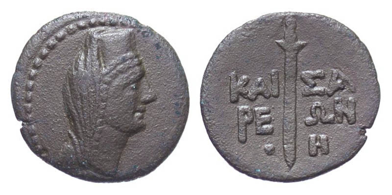 Pontos, Panticapaeum (as Caesarea). Roman Administration. Ca. 14-12 B.C. Æ 8 units (20.1 mm, 3.24 g, 12 h). Veiled and draped bust of Aphrodite Apatura right, wearing kalathos / KAIΣAPEΩN, scepter terminating in pomegranate flower; ·- H at base. MacDonald 274/2; RPC 1936. VF.