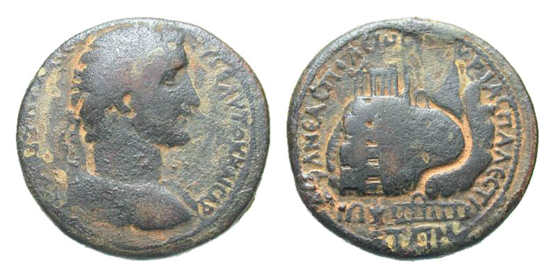Samaria, Neapolis. Antoninus Pius. A.D. 138-161. Æ 34 (33.5 mm, 23.22 g, 12 h). ANTωNINOC CЄBAC ЄVCЄ AYTOK KAICAP, laureate, draped, and cuirassed bust right / ΦΛ NEACΠO-ΛE CYPIAC ΠAΛAICTNHC, Mount Gerizim surmounted by temple complex; stairway flanked by shrines leading towards complex, roadway at mid-height leading to altar, colonnade at base of mountain, [uncertain date in exergue]. cf. Rosenberger 8-9; cf. SNG ANS 965. F/VF.