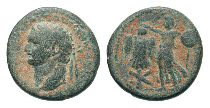 Samaria, Caesarea Maritima. Domitian. A.D. 81-96. Æ 24 (23.8 mm, 10.67 g, 11 h). Struck A.D. 83-96. DOMITIANVS CAES AVG GERMANICVS, laureate head left / Athena standing left, erecting trophy and holding spear and shield. RPC 2305; SNG ANS 493; BMC -. F/VF, attractive red highlights.