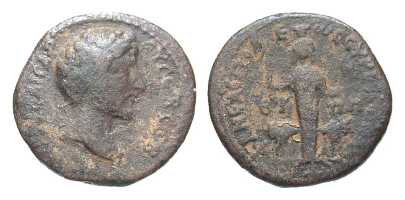 Samaria, Neapolis. Marcus Aurelius. A.D. 161-180. Æ 25 (25.4 mm, 9.08 g, 12 h). Dated CY 88 = A.D. 159/60. AYPHΛIOC KAICAPEY CEB CEBY, bare head right / ΦΛ NEACΠO-ΛE CYPIAC ΠAΛECTNHC, ЄT-PH, Zeus Heliopolites standing facing, holding whip and grain ears, flanked by two bulls. Rosenberger 15; SNG ANS 969; BMC 32. F/VF.