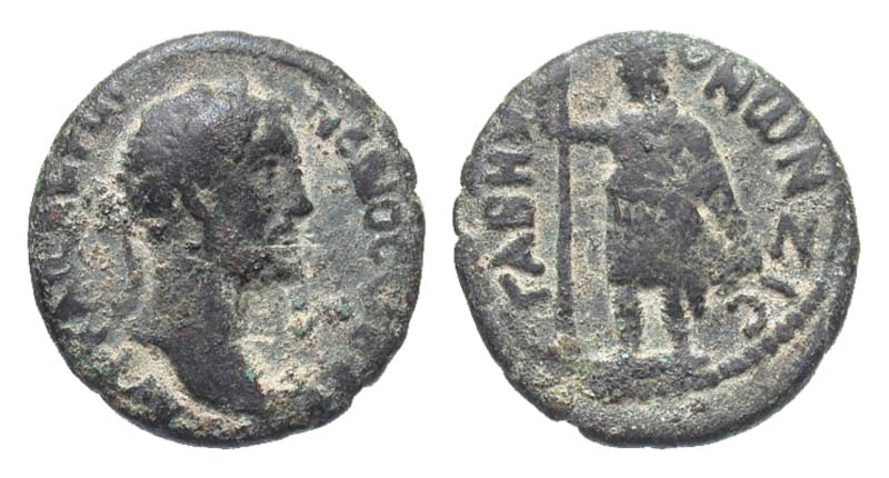 Syria, Trachonitis. Gaba. Antoninus Pius. A.D. 138-161. 25.3 mm, 11.30 g, 12 h). Dated CY 217 = A.D. 156/7. AVT KAIC ANTΩNEINOC CEBAC, laureate head right / ΓABHNΩN ZIC, the god Mên standing left, holding scepter; star and crescent above. SNG ANS 904; Rosenberger 15. F/VF.