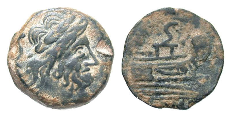 Anonymous. 211-206 B.C. Æ semis (20.9 mm, 7.59 g, 7 h). Sextantal standard. Rome mint. Laureate head of Saturn right, S behind / ROMA, Prow of galley right; S above. Crawford 56/3; Sydenham 143a; BMCRR 229. VF, sandy patina.