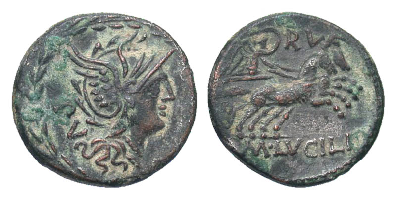 Lot 27-114. M. Lucilius Mn.f. M.n. Rufus. 101 B.C. AE fourrée denarius. Rome mint.