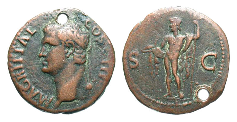 Agrippa. Died 12 B.C. Æ as (27.7 mm, 10.80 g, 7 h). Rome mint, Struck A.D. 37-41. M·AGRIPPA·L·F·COS·III, head left wearing rostral crown / S-C, Neptune standing left, holding small dolphin and trident. RIC 58 (Gaius); BMCRE 161 (Tiberius). Fine, pierced.