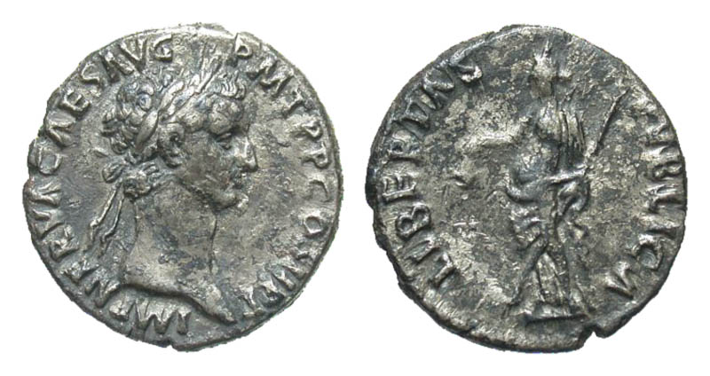 Nerva. A.D. 96-98. AR denarius (17.8 mm, 2.82 g, 7 h). Rome mint, Struck A.D. 97. IMP NERVA CAES AVG P M TR P COS III P P, laureate head right / LIBERTAS PVBLICA, Libertas standing left, holding pileus and scepter. RIC 19; BMCRE 46; RSC 113. VF.