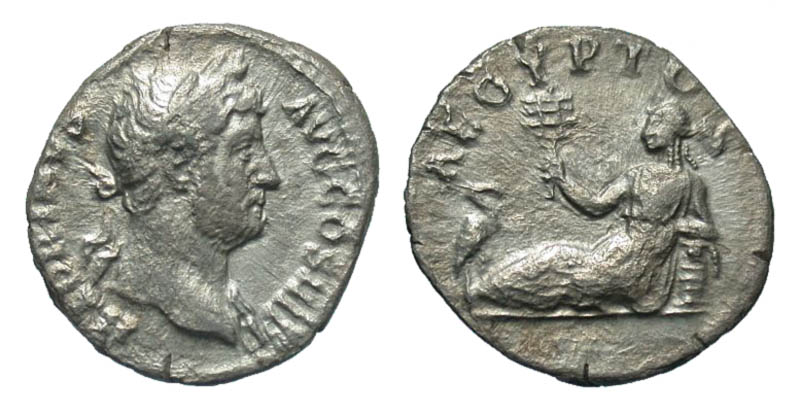 Hadrian. A.D. 117-138. AR denarius (18.3 mm, 2.65 g, 7 h). Rome mint, Struck A.D. 134-138. HADRIANVS AVG COS III P P, laureate head right, draped shoulder / AEGYPTVS, Egypt reclining left on basket, lotus on head, holding sistrum; to left, ibis standing right. RIC 297; BMCRE 799; RSC 99a. aVF.