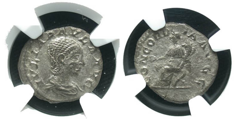 Julia Paula. Augusta, A.D. 219-220. AR denarius (2.58 g). Rome mint. IVLIA PAVLA AVG, diademed and draped bust right / CONCORDIA AVGG, Concordia seated left on curule chair, holding patera and cornucopia. RIC 216 (Elagabalus); BMCRE 321 (Elagabalus); RSC 16a. AU. NGC certified and graded AU; Strike 4/5, Surface 2/5.