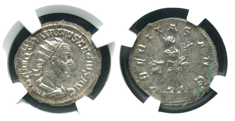 Trajan Decius. A.D. 249-251. AR antoninianus (4.49 g). Rome mint, Struck A.D. 250. IMP C M Q TRAIANVS DECIVS AVG, radiate, draped and cuirassed bust right / VBERITAS AVG, Uberitas standing facing, head left, holding purse and cornucopia. RIC 28b; RSC 105. MS. NGC certified and graded AU; Strike 5/5, Surface 4/5.